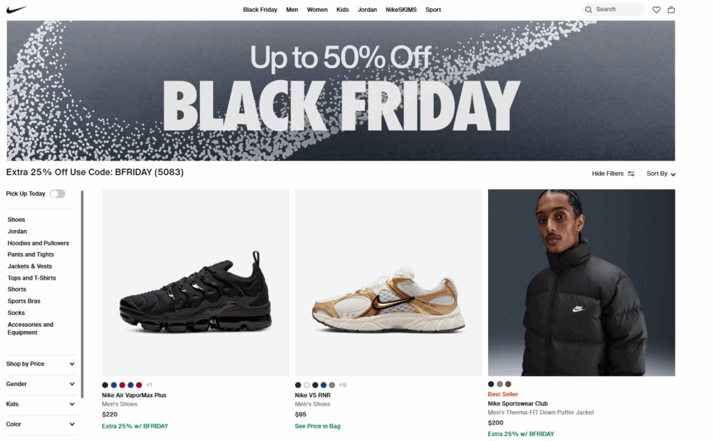 16. Giày Nike và phụ kiện giảm đến 50%. Nhất là khi có thêm code BFriday, giá đã giảm lại còn giảm sâu nữa. Mình hay canh dịp này để nâng cấp đúng một đôi: hoặc giày chạy cho chuyện tập tành, hoặc đôi sneaker trắng dễ phối đi làm, đi chơi.