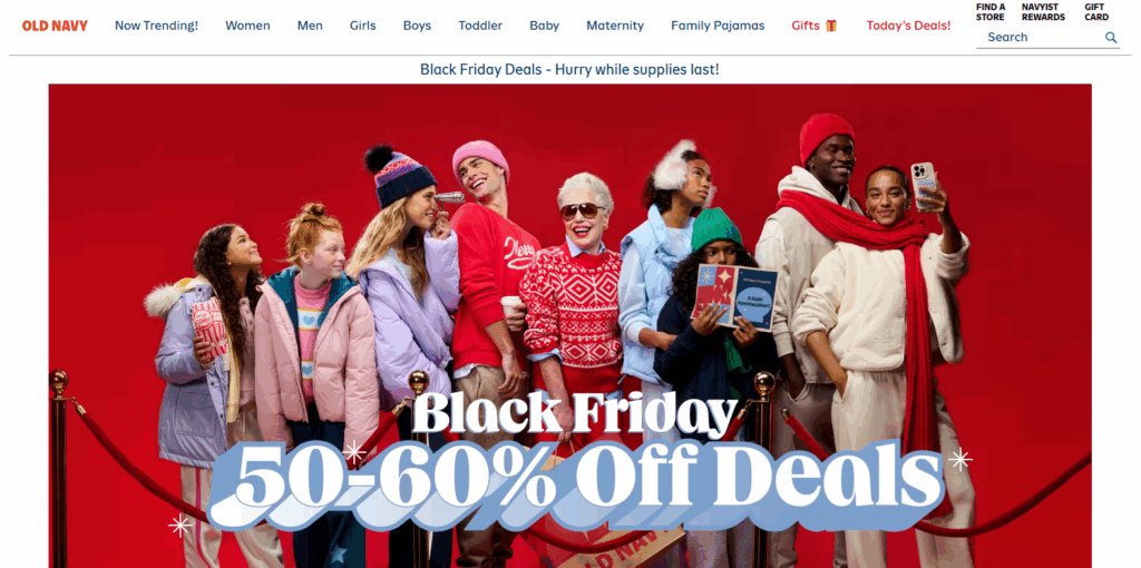 Old Navy Black Friday năm nào cũng “náo loạn” vì giá mềm và đồ basic dễ mặc. Áo thun, hoodie, quần jeans, đồ ngủ, đồ cho cả gia đình… đang giảm sâu, nên web với app lúc nào cũng đông.